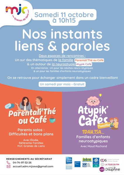 Atypik Cafés : rencontre autour de la neuroatypie, avec en alternance, un samedi pour les adultes neuroatypiques et l'autre pour les familles d'enfants neuroatypiques. Ils seront animés par Maud Rochand, une habitante du territoire qui est à l'initiative de ce projet.