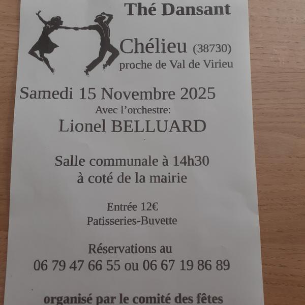 AccueilAgenda Thé dansant Thé dansant Thé dansant organisé par le comité des fêtes de Chélieu et animé par l'orchestre de Lionel Belluard. Pâtisseries et buvette. PrésentationTarifs / OuverturesOuverturesSamedi 15 novembre 2025 de 14h30 à 18h.TarifsPlein tarif : 12 €. « retour à la liste Thé dansant 145 rue de la mairie 38730 Chélieu