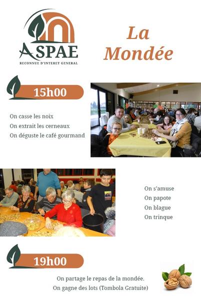 Dîner convivial (à 19h pour 23€) : partage d’un repas dans la bonne humeur, perpétuant l’esprit de solidarité et de fête qui animait jadis la mondée. Tombola gratuite en fin de soirée avec le numéro du ticket de repas.