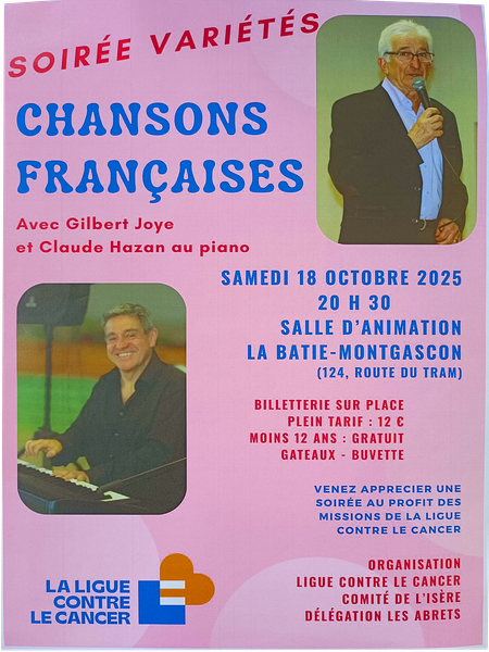 AccueilAgenda Soirée variétés Soirée variétés Chansons françaises avec Gilbert Joye et Claude Hazan au piano, au profit de la Ligue contre le cancer. Pâtisseries et buvette sur place. PrésentationTarifs / OuverturesOuverturesSamedi 18 octobre 2025 à partir de 20h30.TarifsPlein tarif : 12 €. Gratuit pour les moins de 12 ans.Billetterie sur place. « retour à la liste Soirée variétés 38110 La Bâtie-Montgascon