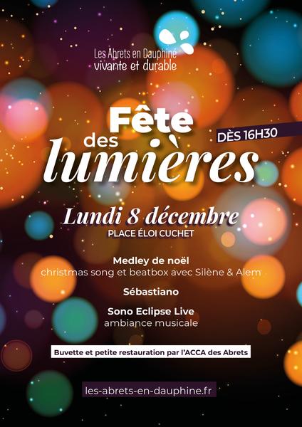 AccueilAgenda Fête des lumières Fête des lumières La traditionnelle fête des lumières anime le centre-bourg des Abrets en Dauphiné, entre illuminations, concert pour petits et grands et animations. En prime, une buvette chaleureuse tenue par l'ACCA des Abrets ! PrésentationTarifs / OuverturesOuverturesLundi 8 décembre 2025 de 16h30 à 21h30.TarifsAccès libre. « retour à la liste Fête des lumières Place Éloi Cuchet 38490 Les Abrets en Dauphiné Site Internet