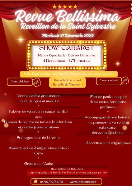 AccueilAgenda Réveillon de la Saint-Sylvestre Réveillon de la Saint-Sylvestre Soirée repas dansant avec Show Cabaret de la Revue Bellissima. PrésentationTarifs / OuverturesOuverturesMercredi 31 décembre 2025 de 20h à 4h.TarifsAdulte : 92 € (Repas /spectacle/Soirée Dansante), Enfant : 20 €.Réservation obligatoire. « retour à la liste Réveillon de la Saint-Sylvestre Rue Pasteur 38110 La Tour-du-Pin Site Internet