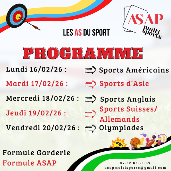 AccueilAgenda ASAP vacances - stage multisports ASAP vacances - stage multisports ASAP VACANCES Un planning varié, attractif et amusant pour chacun ! Inscriptions pour tous, licencié ASAP ou non, à partir de 2019 ➡ Les Supers vacances entre copains PrésentationTarifs / OuverturesOuverturesDu lundi 16 au vendredi 20 février 2026 de 8h à 17h.TarifsTarifs non communiqués. « retour à la liste ASAP vacances - stage multisports 236 Allée des sports 38110 Saint-Clair-de-la-Tour
