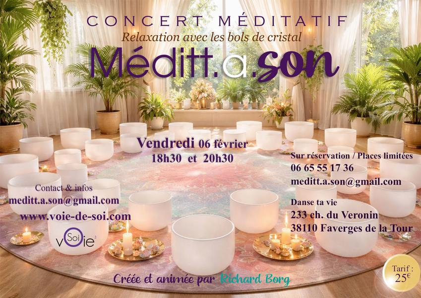 AccueilAgenda Méditt.a.son Méditt.a.son concert de bols de cristal PrésentationTarifs / OuverturesMoyen(s) de paiement accepté(s)Chèque • EspècesOuverturesVendredi 6 février 2026 de 18h30 à 20h30.TarifsTarif unique : 25 € (sur réservation). « retour à la liste Méditt.a.son 38110 Faverges-de-la-Tour Site Internet