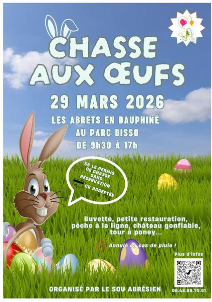 Le Sou des écoles Abrésien organise une grande chasse au œufs, ouverte à tous et sans réservation. Sur place, retrouvez : buvette, petite restauration et animations (poneys, château gonflable, pêche à la ligne).