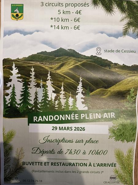 AccueilAgenda Randonnée pédestre Randonnée pédestre 3 circuits avec ravitaillements. Buvette et restauration à l'arrivée (plateau repas). Sur inscription. PrésentationTarifs / OuverturesMoyen(s) de paiement accepté(s)Carte bancaire/crédit • EspècesOuverturesDimanche 29 mars 2026 de 7h30 à 10h.Tarifs4€ les 5 km6€ les 10 et 14 km. « retour à la liste Randonnée pédestre 38110 Cessieu