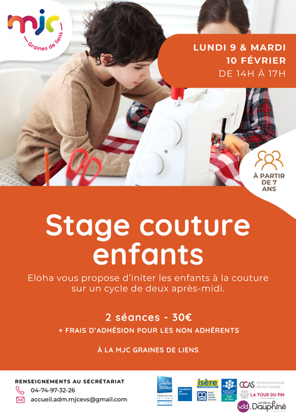 AccueilAgenda Initiation à la couture pour les enfants Initiation à la couture pour les enfants Eloha vous propose d’initer les enfants à la couture sur un cycle de deux après-midi. PrésentationTarifs / OuverturesOuverturesLundi 9 février 2026 de 14h à 17h.Mardi 10 février 2026 de 14h à 17h.TarifsPlein tarif : 30 €.Frais d'inscription pour les non-adhérents. « retour à la liste Initiation à la couture pour les enfants 35 rue Jean Lescure 38110 La Tour-du-Pin Site Internet