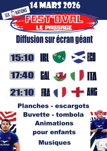 AccueilAgenda Fest'Oval Fest'Oval Diffusion sur écran géant du Tournoi des Six Nations : France VS Angleterre. Ambiance pub avec planches, escargots et buvette. Animations pour les enfants de 15h à 17h30. PrésentationTarifs / OuverturesOuverturesSamedi 14 mars 2026 à partir de 15h.TarifsGratuit. « retour à la liste Fest'Oval 21 route de st didier 38490 Le Passage