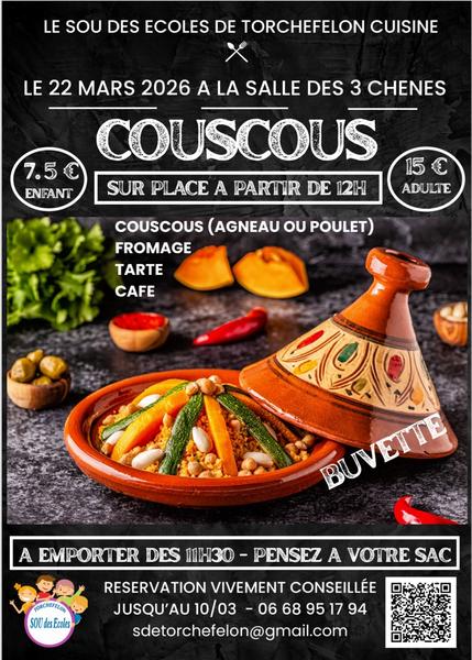 Le sou des écoles cuisine son traditionnel couscous afin de financer les sorties scolaires. Menu couscous agneau ou poulet à déguster sur place ou à emporter.