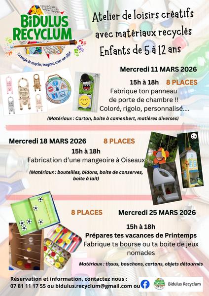 Ateliers créatifs Bidulus Recyclum : ne jetez plus, créez ! Jeux et objets utiles fabriqués à partir de déchets recyclés. Enfants de 5 ans à 12 ans. 100% manuel, 100% éco. Participez et repartez avec vos créations !