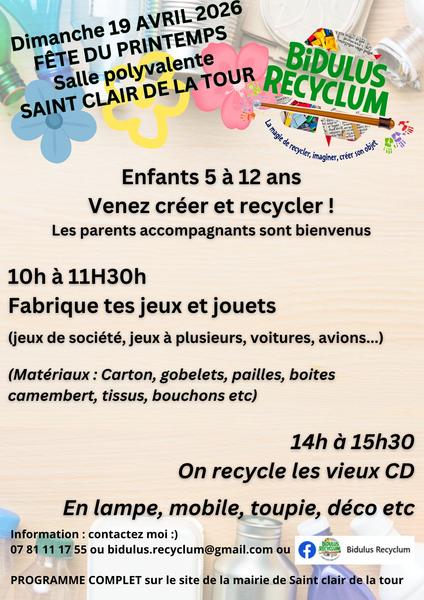 A l'occasion de la fête du Printemps, l'association BIDULUS RECYCLUM sera présente sur un stand pour vendre quelques créations et proposer deux ateliers, le matin 10H -11H30 Fabrique tes jeux et jouets et l'après midi 14H - 15H30 On recycle les vieux CD.