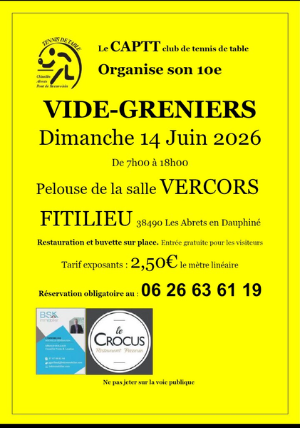 AccueilAgenda Vide-greniers Vide-greniers Vide-greniers avec buffet et buvette sur place. PrésentationTarifs / OuverturesTarification Exposants : 2.50 euros le mètre linéaireOuverturesDimanche 14 juin 2026 de 7h à 19h.TarifsGratuit. « retour à la liste Vide-greniers 290 CHEMIN DES FREYDIERESFITILIEU 38490 Les Abrets en Dauphiné Site Internet
