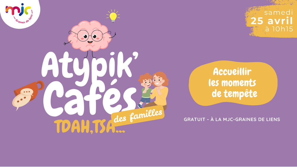 AccueilAgenda Atypik' Cafés des familles Atypik' Cafés des familles On se retrouve dans un cadre simple et convivial pour échanger, souffler et partager nos réalités, idées et ressources, sans pression ni jugement. PrésentationTarifs / OuverturesOuverturesSamedi 25 avril 2026 à partir de 10h15.TarifsGratuit. « retour à la liste Atypik' Cafés des familles 35 rue Jean Lescure 38110 La Tour-du-Pin Site Internet