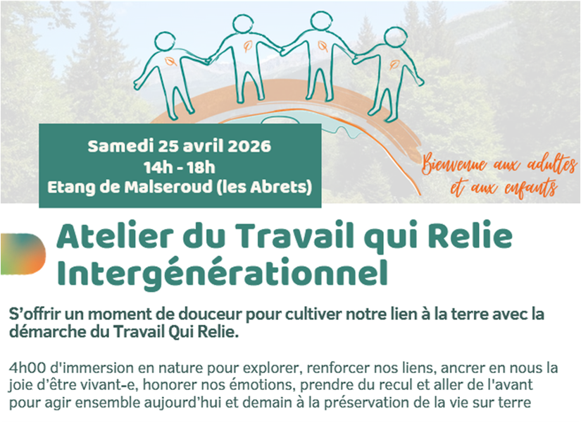 Cet atelier, selon le processus du Travail Qui Relie, créé par Joanna Macy, est ouvert à toute personne adulte et/ou adulte avec enfant(s) de plus de 8 ans, qui souhaitent découvrir cette pratique d’éco-psychologie, ou tout simplement gouter à un temps de partage et d’échanges intergénérationnels en extérieur.