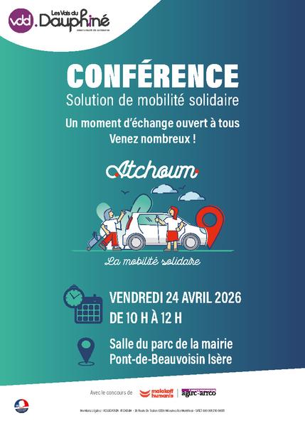 AccueilAgenda Conférence Atchoum Conférence Atchoum Atchoum est une solution de mobilité solidaire pour les habitants et travailleurs locaux. PrésentationTarifs / OuverturesOuverturesVendredi 24 avril 2026 de 10h à 12h.TarifsGratuit. « retour à la liste Conférence Atchoum 38480 Pont-de-Beauvoisin Site Internet