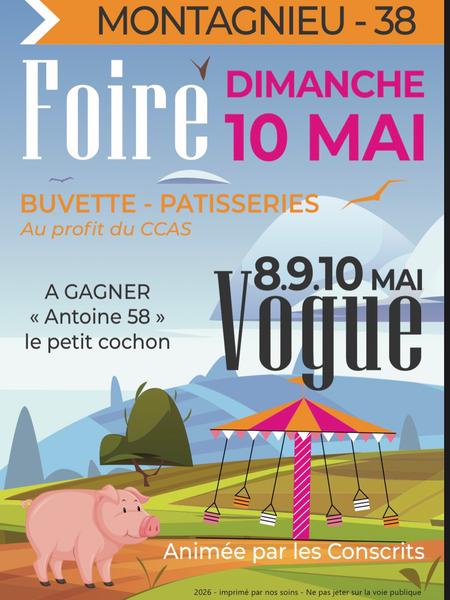 AccueilAgenda Foire de Montagnieu Foire de Montagnieu Foire avec une quarantaine d'exposants, buvette et restauration rapide. Tombola et vogue des conscrits. Au profit du CCAS. PrésentationTarifs / OuverturesOuverturesDu vendredi 8 au dimanche 10 mai 2026 à 18h.TarifsGratuit. « retour à la liste Foire de Montagnieu Route du village 38110 Montagnieu
