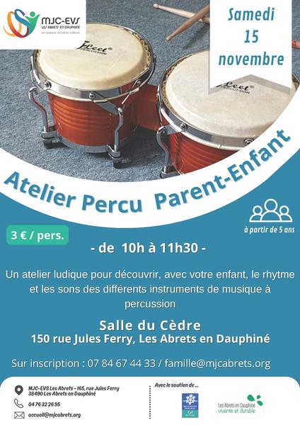 HomeEvents program Atelier parent-enfant « percussions » Un atelier ludique et rigolo pour découvrir, avec votre enfant, le rythme et les sons des différents instruments de musique à percussions. À partir de 5 ans. PresentationPrices / Opening hours Payment type allowedCheque • CashOpeningsSaturday 15 November 2025 between 10 am and 11.30 am.PricesOne price: 3 €. « back to the list 150 Rue Jules Ferry 38490 Les Abrets en Dauphiné Website