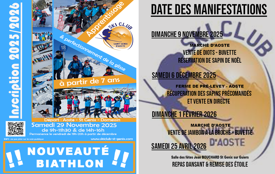 Le Ski-Club organise, lors du marché du dimanche matin, un buvette avec vente de diots. Il sera également proposé de réserver des sapins de Noël qui seront disponible le samedi 6 décembre à la ferme de Pré-Levey à Aoste.