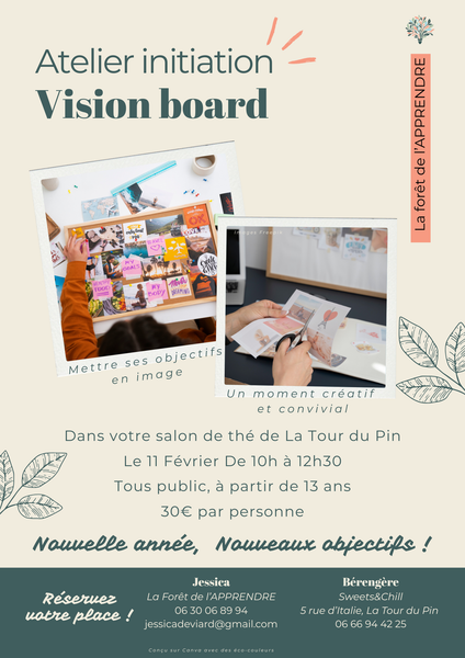Le vision board est un outil pour visualiser ses objectifs afin de clarifier ses projets. C'est aussi une source de motivation et d'inspiration pour atteindre ces objectifs. Concrètement, chaque participant repartira avec une planche sur laquelle il aura assemblé et collé des images choisies avec réflexion.