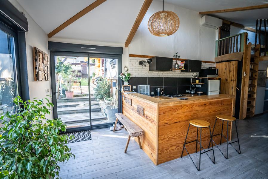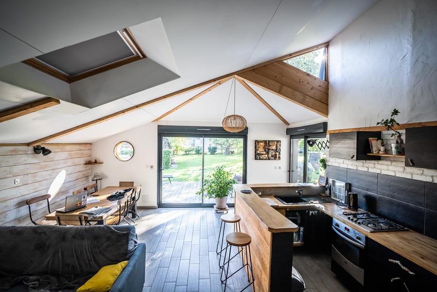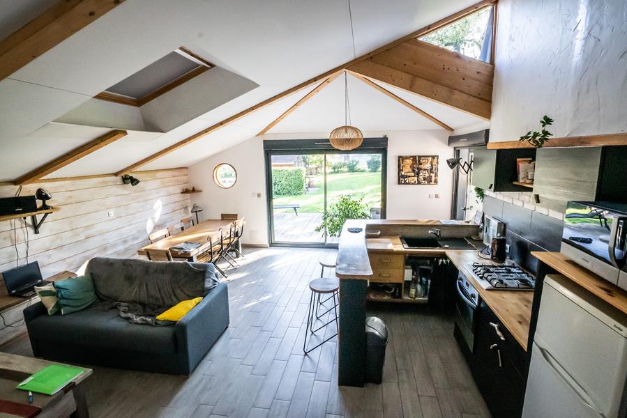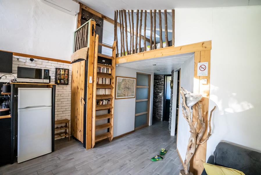 Grande pièce de vie, cuisine équipée/coin salon avec 2 canapés (1 convertible 160/2 pers.)+ grande table 10 pers/1 chambre avec 2 lits simples + 1 lit d'appoint/mezzanine avec matelas au sol (1x2 +2x1 = 4 pers)/SDB avec douche à l’italienne/1 WC/terrasse extérieure privative.