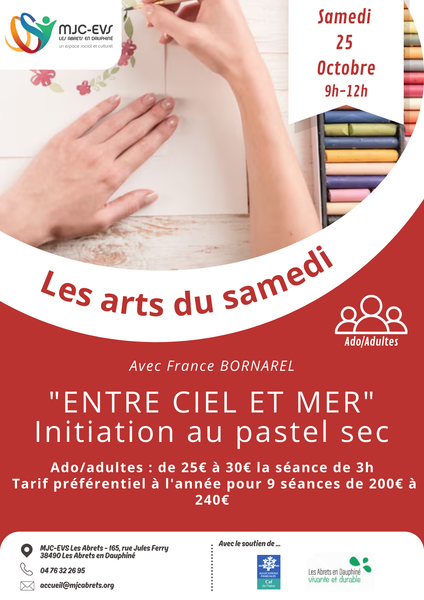 Le dernier samedi du mois sur 9 séances ado/adulte, un thème différent à chaque séance avec plusieurs techniques comme le pastel sec, l'aquarelle, la craie blanche ou encore les crayons de couleurs.
