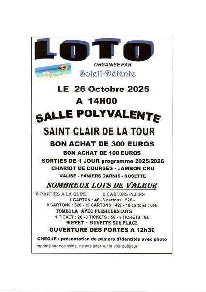Loto : carton 4€ - 6 cartons 22€ - 9 cartons 32€ - 12 cartons 42€