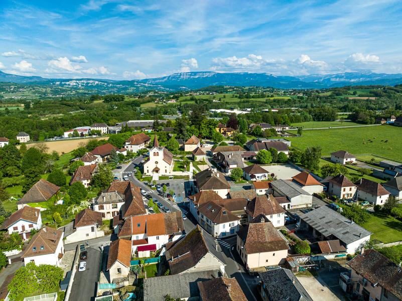 Sur les hauteurs du village de Chimilin, des vues agréables vous attendent avec de belles maisons aux toitures dauphinoises, le massif de Chartreuse et le Mont du Chat au loin.