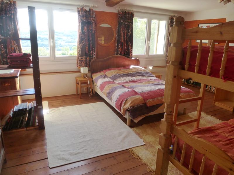 une chambre familiale avec un lit double, deux lits superposés et un lavabo, vue sur les montagnes.